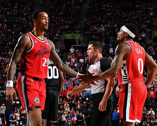 本场比赛中,快船的先发后场新援布拉德利-比尔(Bradley Beal)面对着自己的老东家的表现其实还是不错的。比尔全场出场19分37秒,投篮9中4,三分线外4中2,罚球2中2,得到了12分3助攻1抢断的数据,还有1次失误和1次犯规,正负值为+4。比尔在进攻端的效率其实还算正常,也是通过各种方式拿下了不少分数,而且也展现出了分享球方面的能力。比尔在防守端也能够起到一定的作用,他在场上时球队的整体局面也是值得肯定的。只是问题就在于,比尔的出场时间依然是受到了严格地限制,球队教练组依然是选择了掐点换人,再加上出手次数也不是太多,比尔确实是很难在这种情况下发挥出自己的全部实力。如果比尔能够得到更多的出场时间,说不定快船的竞争力也会有明显的提升。